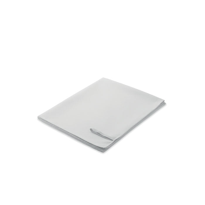 Toalla de microfibra fabricada en 90% poliéster y 10% poliamida, ligera y de secado rápido. Incorpora lazo elástico para colgar, facilitando su uso tras actividades deportivas, viajes o jornadas en la playa. Su tamaño de 70 × 120 cm ofrece una superficie amplia manteniendo un formato cómodo de transporte. Una opción práctica para gimnasios, eventos promocionales, acciones corporativas o regalos funcionales vinculados al deporte y al ocio activo.