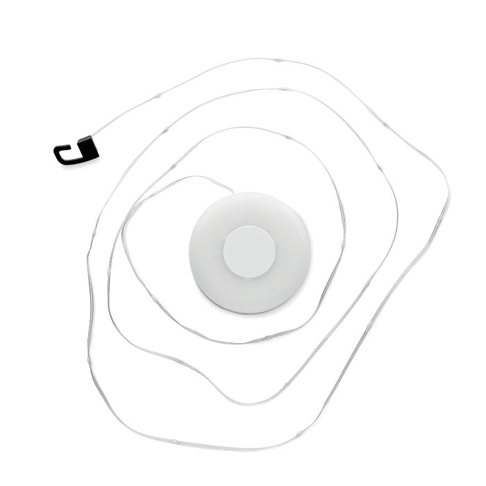 Cuerda de luces LED retráctil fabricada en resistente ABS, ideal para iluminar de forma práctica y portátil. Incluye cable de carga tipo C y batería recargable de 1000 mAh para un uso prolongado sin conexión eléctrica. Ofrece 5 niveles de intensidad regulable y puede colgarse como lámpara portátil gracias a su diseño funcional. Su cable tiene una longitud de 8 cm, lo que facilita su colocación en diferentes espacios. Perfecta para actividades al aire libre, eventos nocturnos o como regalo promocional versátil que refuerza la visibilidad de tu marca.