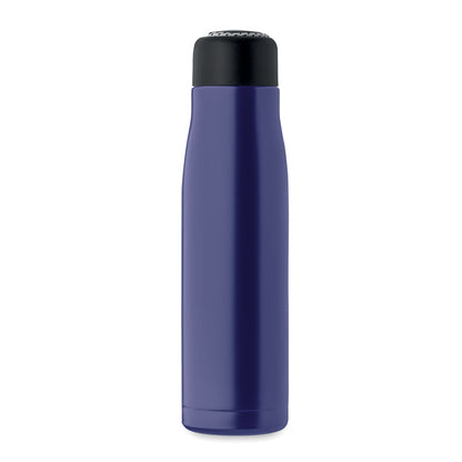 Botella de doble pared con aislamiento al vacío, fabricada con un 90% de acero inoxidable reciclado y 10% de acero inoxidable, ideal para mantener la temperatura de tus bebidas. Tiene una capacidad de 500 ml y cuenta con tapa de polipropileno (PP) con asa de cordón integrada para un transporte cómodo. Su diseño antifugas garantiza seguridad en cada uso. Con unas dimensiones de 6,5 cm de ancho y 25 cm de alto, es práctica y sostenible. Personalízala con tu logotipo y transmite el compromiso ecológico de tu marca con un regalo promocional útil y responsable.