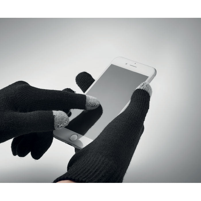 Set de invierno de 3 piezas. Incluye gorro de RPET, bufanda y guantes táctiles con etiqueta para la zona de impresión.