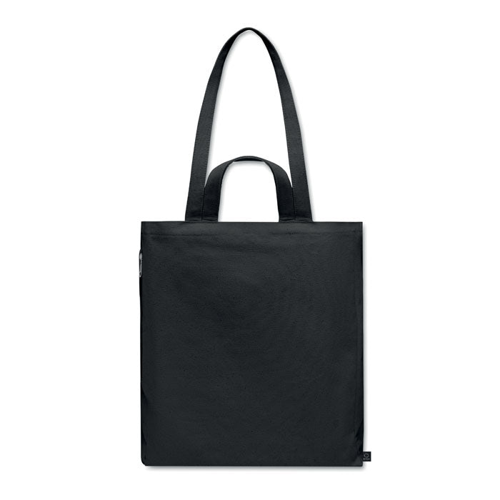 Bolsa de poli algodón reciclado (70% algodón, 30% poliéster) resistente y ecológica, perfecta para la compra o la playa. Con tejido de 380 g/m², ofrece durabilidad y un tacto suave. Cuenta con asas cortas y un bolsillo lateral con cremallera para mayor comodidad y seguridad. Su diseño práctico y sostenible la convierte en un regalo promocional que transmite compromiso ambiental y funcionalidad. Ideal para eventos, ferias o empresas que buscan destacar con productos responsables y útiles.