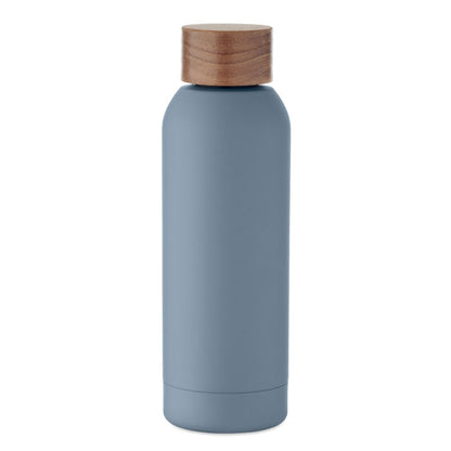 Botella de pared simple con capacidad de 700 ml, fabricada en un 90% de acero inoxidable reciclado y un 10% de acero inoxidable virgen. Presenta un acabado exterior en caucho que mejora el agarre y tapa de madera de acacia que aporta un diseño natural. Dispone de sistema antifugas, aunque al ser de pared simple puede producirse transferencia de calor. Ideal como regalo promocional sostenible en oficinas, ferias o eventos corporativos, encajando también en campañas de merchandising ecológico. Un accesorio práctico que refuerza la imagen responsable de la marca.