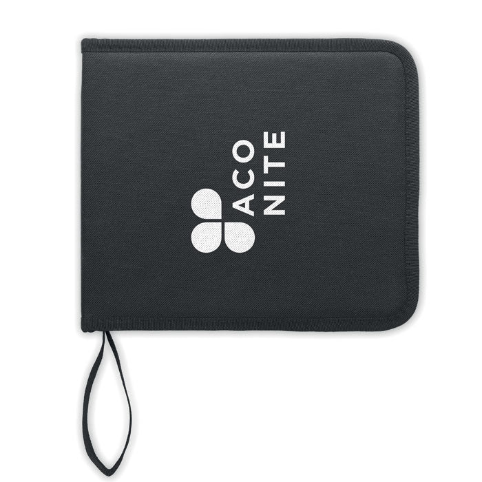 Set profesional de dibujo de 40 piezas. Incluye: 14 lápices, 12 rotuladores de colores, 1 papel de lija, varios rotuladores de carboncillo, 1 lápiz de grafito sin madera, 1 extensor de lápices, 1 sacapuntas, 1 goma de borrar, 1 pincel y 1 cuchillo de manualidades. Presentado en un resistente estuche con cremallera de poliéster RPET 450D.