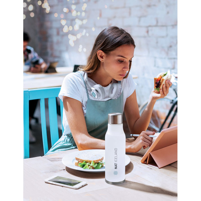 Botella translúcida de RPET con acabado suave y capacidad de 600 ml, libre de BPA y perfecta para uso diario. Cuenta con tapón de acero inoxidable con interior de RPET y anillo de silicona que garantiza un cierre antifugas seguro. No apta para bebidas gaseosas, es ideal para agua y zumos. Sus dimensiones de 6 cm de ancho y 23 cm de alto la hacen fácil de transportar y almacenar. Un producto sostenible y funcional, ideal para regalos promocionales. Personalízala con tu logotipo y refuerza la imagen ecológica de tu marca con un artículo de calidad.