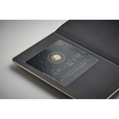 Libreta A5 con tapa rígida de papel sostenible y 184 páginas rayadas en papel reciclado. Incluye marca páginas de algodón y semillas según el color del cuaderno: arándano, fresa, margarita blanca, manzana o pino. Medidas: 13,4 × 21,3 × 1,7 cm. Fabricada en la UE, es un regalo promocional original con bajo impacto medioambiental. Perfecta para oficinas, eventos responsables o campañas ecológicas. Personalízala con tu logotipo y transmite valores de sostenibilidad y cuidado por la naturaleza en cada página.