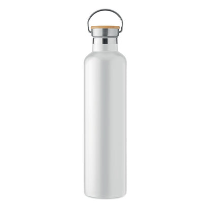 Botella de acero inoxidable de doble pared con aislamiento al vacío y capacidad de 1 litro, diseñada para mantener tus bebidas a la temperatura ideal durante horas. Cuenta con tapa de bambú natural y asa de transporte que facilitan su uso diario, aunque el color del bambú puede variar por tratarse de un material natural. Sus dimensiones de 8 cm de ancho y 31,5 cm de alto la hacen práctica y resistente. Un regalo promocional perfecto para empresas que apuestan por calidad y sostenibilidad. Personalízala con tu logotipo y destaca tu marca con estilo y funcionalidad.