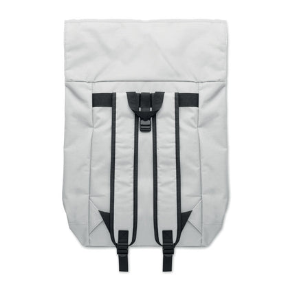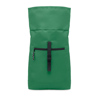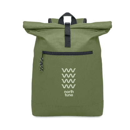 Mochila de poliéster 600D con cierre roll top y compartimento para portátil de 15". Diseño cómodo con respaldo y correas acolchadas, más base reforzada para mayor resistencia. Incluye bolsillo frontal con cremallera y forro interior de poliéster RPET 210D. Medidas: 45 × 30 × 12 cm aprox. . Personalízala con el logotipo de tu empresa y utilízala como regalo promocional útil, moderno y ecológico. ¡Haz visible tu marca con estilo y funcionalidad!