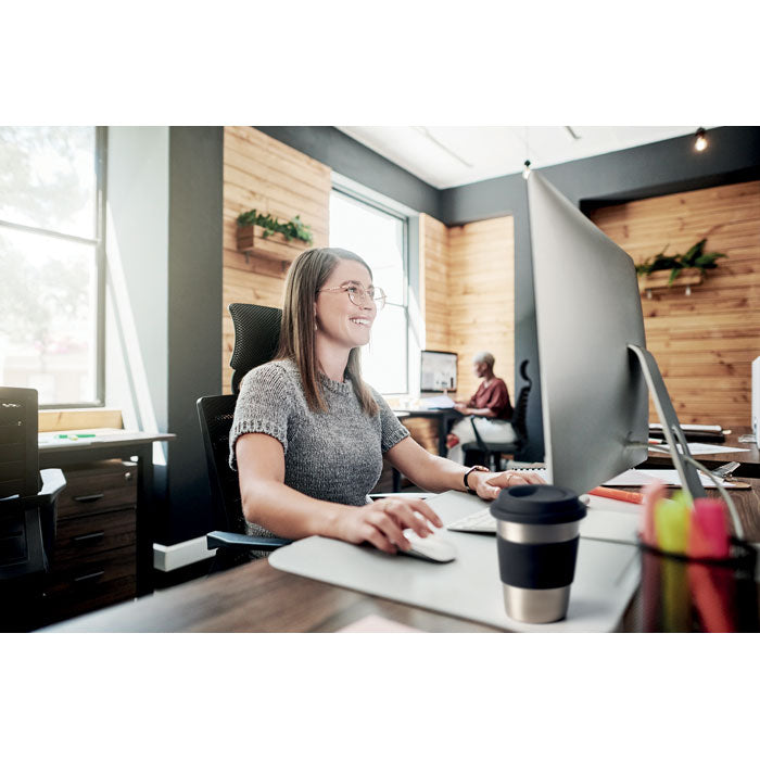 Vaso de acero inoxidable de una sola pared con tapa y asa de silicona, ideal para bebidas calientes o frías con capacidad de 350 ml. Mide 8 cm de diámetro y 11 cm de alto. Perfecto para regalos promocionales personalizados, oficinas o campañas ecológicas.