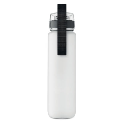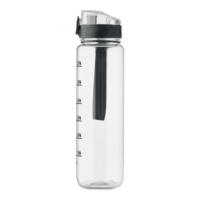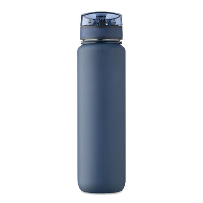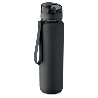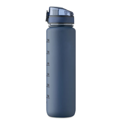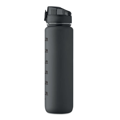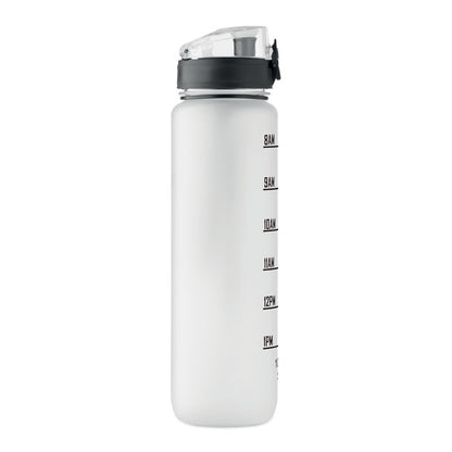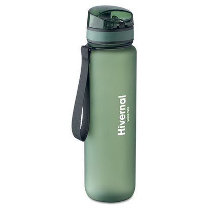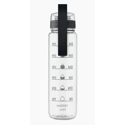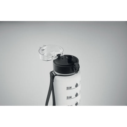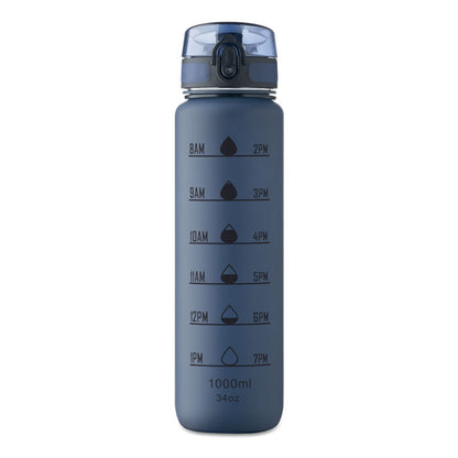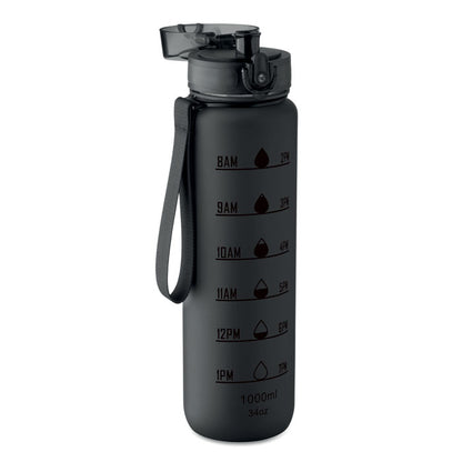 Botella deportiva de 1 litro fabricada en RPET, con marcas de tiempo impresas para motivar la hidratación diaria. Cuenta con tapa abatible de apertura con una sola mano, cierre de seguridad y correa de transporte para mayor comodidad. Su diseño antifugas la convierte en una opción práctica y segura para el día a día, actividades deportivas o promociones sostenibles. Ideal para campañas de bienestar o eventos corporativos activos. Personalízala con el logotipo de tu empresa y haz que tu marca acompañe cada sorbo.