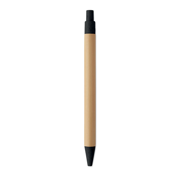 Bolígrafo con cuerpo de bambú natural y pulsador, acompañado de accesorios fabricados en una combinación de paja de trigo (50%) y plástico ABS (50%). Es una opción ecológica, ligera y cómoda para la escritura diaria, con tinta azul de gran fluidez. Su diseño sostenible lo convierte en un obsequio promocional ideal para empresas comprometidas con el medio ambiente en ferias, congresos o campañas corporativas. Puede personalizarse con el logotipo o nombre de tu marca, ofreciendo un detalle práctico y respetuoso que refuerza tu imagen empresarial.