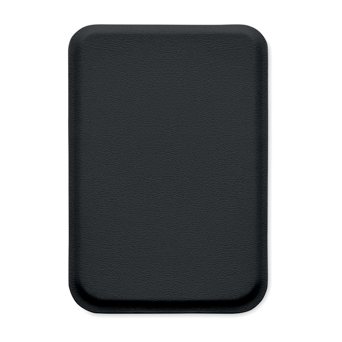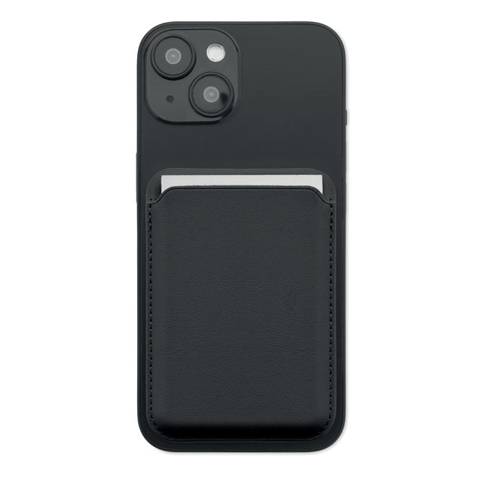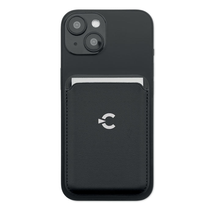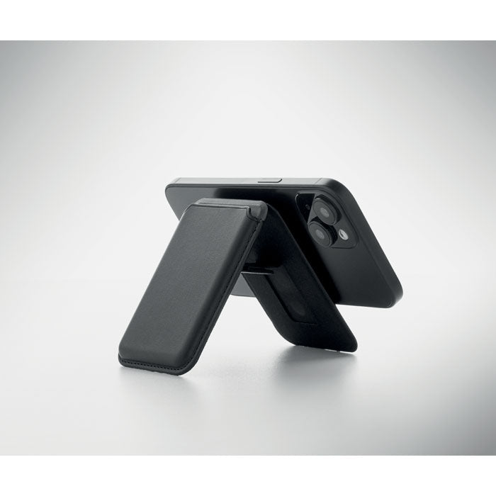 Tarjetero magnético fabricado en polipiel de PU, diseñado para llevar hasta 3 tarjetas de crédito de forma segura y accesible. Incorpora sistema magnético para fijarse al teléfono móvil y función de soporte, permitiendo apoyar el dispositivo tanto en vertical como en horizontal. Incluye una anilla metálica adicional que mejora el agarre y la comodidad de uso. Un accesorio moderno y funcional, ideal como regalo promocional en acciones comerciales, eventos corporativos y campañas de marketing.