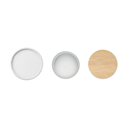 Vela de cera vegetal con fragancia de plantas, presentada en tarro de cristal opaco con tapa de bambú natural. Peso: 200 g. Tiempo de combustión: aproximadamente 33 horas. Incluye caja de papel tubular de regalo, perfecta para presentaciones cuidadas y sostenibles. Medidas: 9,35 × 12 cm. Ideal para promociones de bienestar, campañas ecológicas o regalos corporativos con estilo. Cada unidad puede variar ligeramente en color por el uso de bambú natural. Personalizable con logotipo, refuerza tu imagen de marca con un detalle aromático, elegante y respetuoso con el medioambiente que invita al relax.
