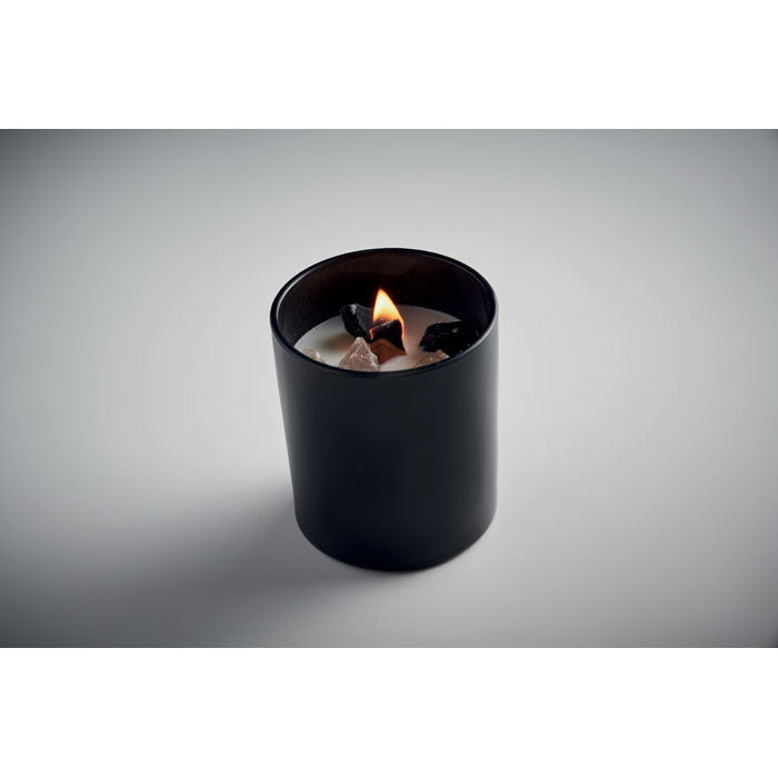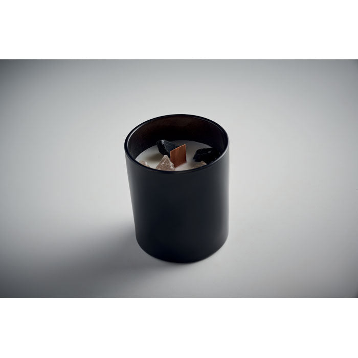 Vela de cera vegetal con fragancia de vainilla, presentada en vaso de vidrio decorado con piedras y mecha de madera. Peso: 200 g. Tiempo de combustión: hasta 20 horas. Medidas: 8,2 × 9,2 cm. Ideal para crear ambientes cálidos y acogedores en el hogar, oficinas o espacios de relax. Su diseño natural y elegante la convierte en un regalo promocional perfecto para campañas de bienestar, decoración o eventos corporativos. Personalizable con logotipo, transmite una imagen de marca cuidada, sensorial y alineada con valores sostenibles. Un detalle funcional con un toque aromático y estético.