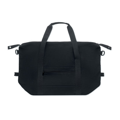 Bolsa de fin de semana fabricada con 70% algodón preconsumo reciclado y 30% poliéster reciclado, forrada en poliéster RPET 210D. Cuenta con bolsillo frontal y trasero con cremalleras, correa ajustable y desmontable, fondo acolchado y soporte trolley. Sus medidas (60x29x22 cm) ofrecen gran capacidad y comodidad para viajes cortos. Un regalo promocional premium, sostenible y funcional, ideal para empresas que apuestan por calidad y cuidado ambiental.