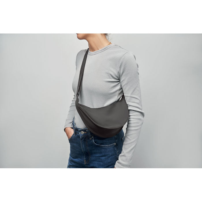 Bolsa bandolera en forma de medialuna, confeccionada en Oxford 400D con forro interior de RPET 210D. Cuenta con un amplio bolsillo principal con cremallera y dos compartimentos interiores, ofreciendo organización y comodidad en el día a día. Ligera y práctica, es perfecta para ferias, congresos o como accesorio corporativo. Su diseño moderno se adapta a diferentes usos, convirtiéndose en un detalle promocional versátil. Puede personalizarse con el logotipo o nombre de tu empresa, reforzando tu imagen de marca en cada evento con un artículo funcional y atractivo.