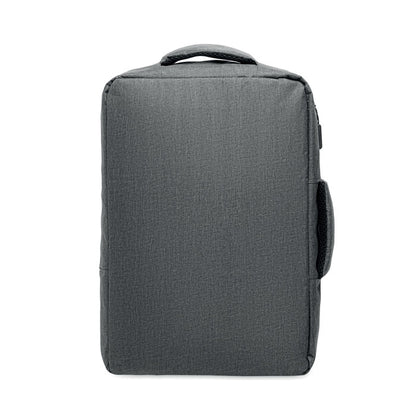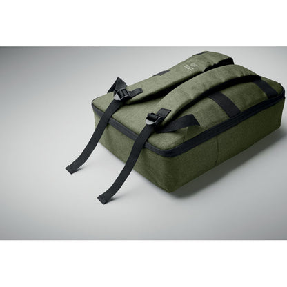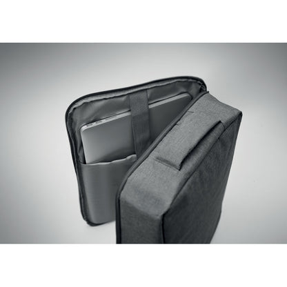 Mochila delgada para portátil de 15" fabricada en resistente 300D RPET con forro de 210D RPET. Dispone de compartimento principal para portátil, dos bolsillos internos, espacios para bolígrafos y asas acolchadas para mayor comodidad. Espalda y tirantes acolchados garantizan un uso ergonómico, además de contar con soporte para trolley que facilita el transporte. Con unas medidas de 41 × 29 × 11 cm, es ideal para regalos promocionales personalizados que combinan funcionalidad y compromiso ambiental.