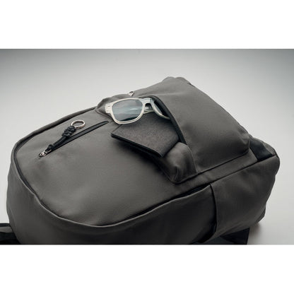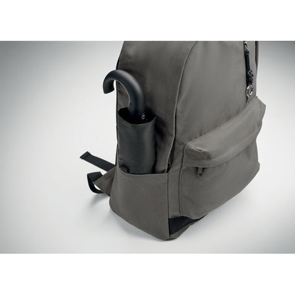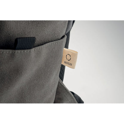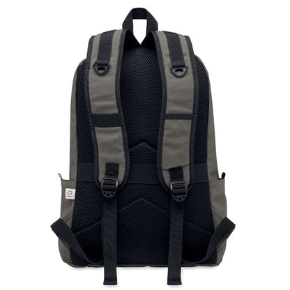 Mochila para portátil de 15" fabricada en lona reciclada lavada de 450 g/m², resistente y ecológica. Cuenta con un gran bolsillo frontal con cremallera, compartimento interior para el portátil, pequeño bolsillo frontal y dos laterales para mayor organización. Espalda, hombreras acolchadas y refuerzos en panel trasero y base ofrecen comodidad y protección. Con medidas de 30 × 18 × 45 cm, es ideal para regalos promocionales personalizados que refuercen tu marca con un diseño sostenible y funcional.