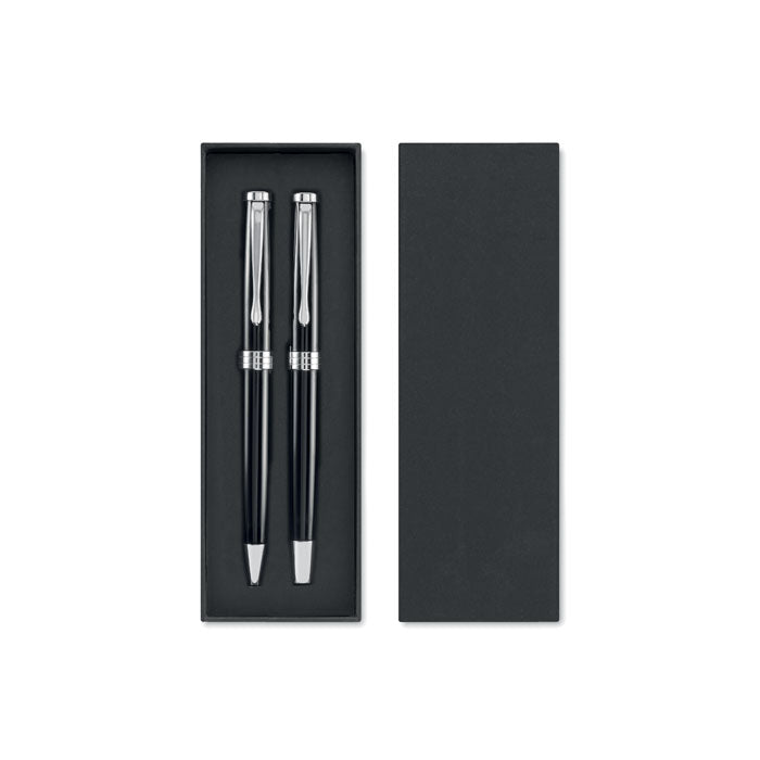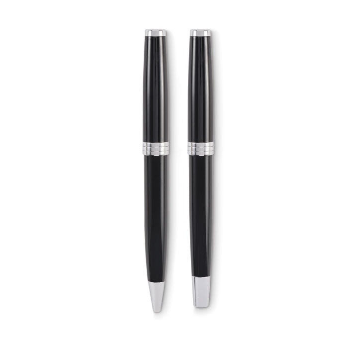 Set de escritura compuesto por bolígrafo con tinta azul y roller con tinta negra, ambos fabricados en acero inoxidable reciclado para un acabado moderno y resistente. Presentado en estuche, resulta un obsequio perfecto para oficinas, ferias y congresos, aportando profesionalidad y estilo. Su diseño combina sostenibilidad y practicidad, convirtiéndose en una opción muy apreciada como regalo corporativo. Puede personalizarse con el logotipo o nombre de tu empresa, logrando que cada detalle refuerce tu imagen de marca con un accesorio elegante y funcional.