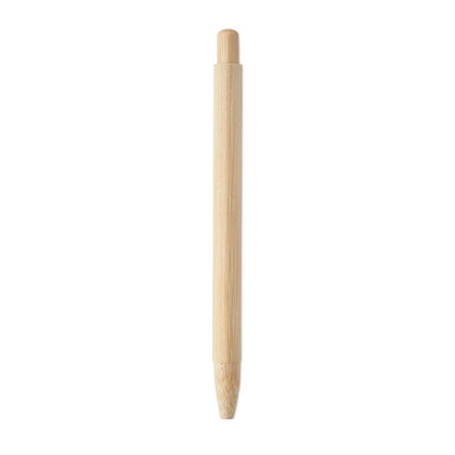 Bolígrafo automático con mecanismo de pulsador, fabricado íntegramente en bambú, incluyendo cuerpo, punta y clip. Su diseño natural y minimalista lo convierte en una opción ecológica y elegante para campañas sostenibles, eventos corporativos o material de oficina personalizado. Con tinta azul, ofrece una escritura suave y profesional. Un artículo funcional que transmite compromiso con el medioambiente. Personalízalo con el logotipo de tu empresa y refuerza tu imagen con un detalle responsable y distintivo.