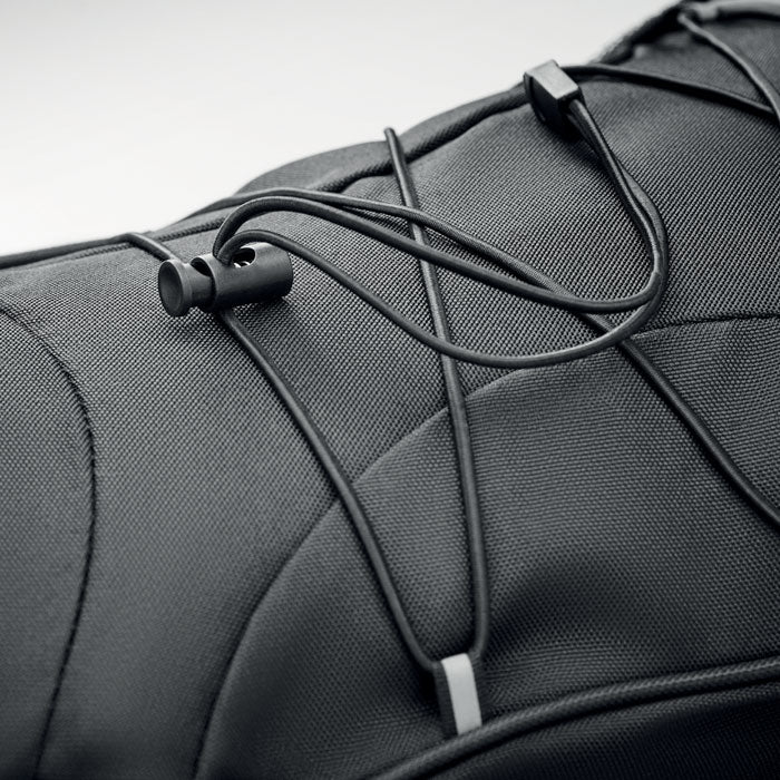 Mochila jaspeada en RPET 600D con cordón decorativo frontal que le aporta un diseño moderno. Incluye bolsillos de malla laterales ideales para botellas u objetos pequeños. Sus medidas de 29 × 16 × 46 cm ofrecen una gran capacidad, perfecta para el día a día. Una opción funcional y sostenible para campañas promocionales, ideal para personalizar con el logotipo de tu empresa y aumentar la visibilidad de tu marca.