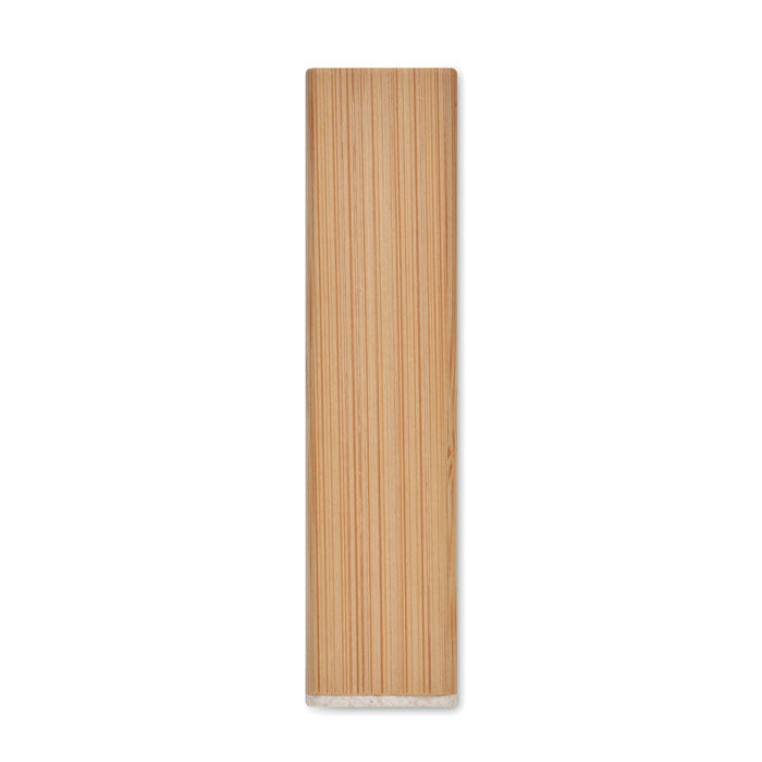 Powerbank de 2600 mAh en estuche de bambú. Capacidad para smartphone, corriente de salida DC5V/1A. Incluye cable de carga USB tipo C con adaptador tipo A. Entrada/Salida: USB Tipo-C.