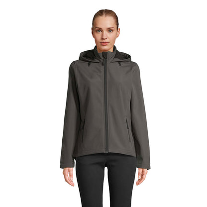 Chaqueta softshell con capucha para mujer SOL’S RACE HOODED WOMEN, confeccionada en 100 % poliéster reciclado con forro polar interior también reciclado (2 capas). Diseñada para ofrecer comodidad y protección, cuenta con cierre frontal, bolsillos laterales con cremallera de nailon negro, tiradores a juego y capucha ajustable con cordón. Su espalda ligeramente más larga mejora el ajuste y la movilidad. Una prenda técnica, sostenible y moderna, perfecta para equipaciones laborales, actividades al aire libre o merchandising corporativo ecológico.