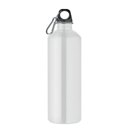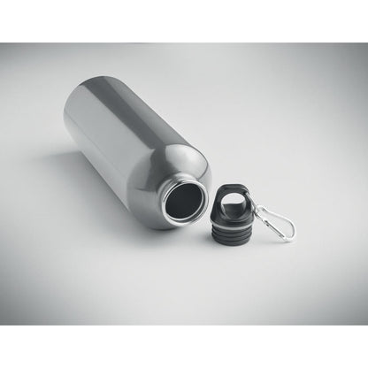 Botella de pared simple de 1000 ml fabricada con 90% acero inoxidable reciclado y 10% acero inoxidable. Lleva tapa de PP con mosquetón metálico para colgarla en mochila o bolsa. Su diseño liso y actual encaja en acciones de merchandising sostenible, eventos deportivos, ferias y regalos corporativos. Aporta buena capacidad sin ocupar demasiado y es cómoda para uso diario en oficina, gimnasio o excursiones. Cierre de rosca seguro para evitar fugas. Al ser de pared simple, puede producirse transferencia de calor, así que mejor para agua y bebidas frías.