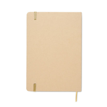 Libreta A5 con tapa rígida de cartón reciclado en tono beige. Incluye 160 páginas rayadas de papel reciclado (80 hojas), banda elástica y marcapáginas a juego. Ideal como regalo promocional para oficinas, eventos o escuelas que valoran la sostenibilidad. Su superficie permite grabado láser, revelando un color brillante que resalta el logotipo. Perfecta para merchandising ecológico o acciones de branding responsable. Dale visibilidad a tu marca con un detalle práctico y alineado con el compromiso medioambiental. Personalízala y hazla destacar en tu próxima campaña.