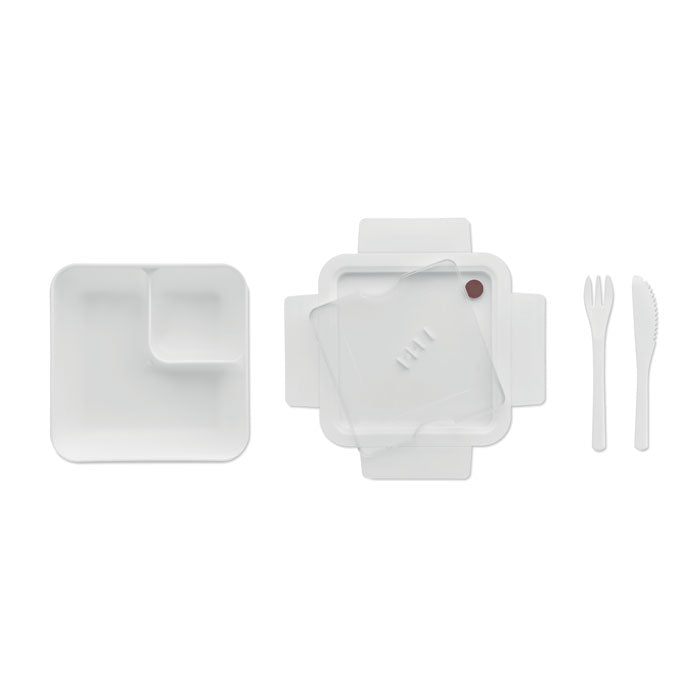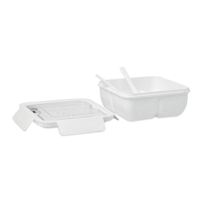 Fiambrera de polipropileno con dos compartimentos y capacidad de 600 ml, ideal para llevar almuerzos o snacks al trabajo, escuela o excursiones. Incluye juego de cubiertos integrado en la tapa, también en PP, para mayor comodidad. Con medidas de 16,5 × 16,5 × 7 cm, es práctica, ligera y reutilizable. Perfecta para campañas de promoción en oficinas, eventos saludables o acciones de merchandising funcional. Personalizable con logotipo para dar visibilidad a tu marca en contextos cotidianos y sostenibles.