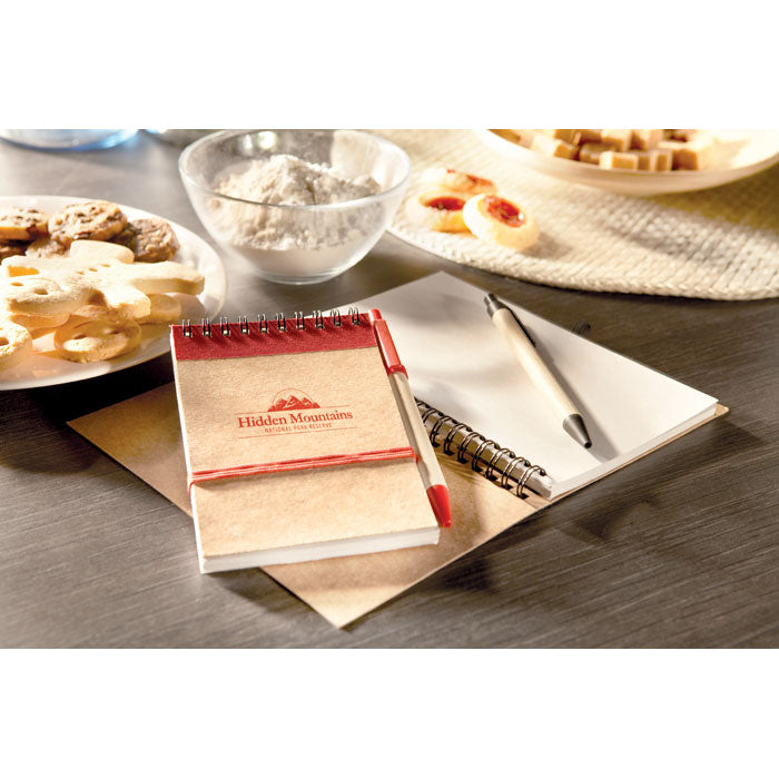 Libreta de bolsillo A6 con 70 hojas de papel reciclado, acompañada de bolígrafo con tinta azul fabricado en plástico reciclado y piezas biodegradables. Compacta y ligera (14 x 9 cm), es perfecta para ferias, formaciones o como detalle en eventos sostenibles. Su formato práctico cabe en bolsos o mochilas y transmite un mensaje claro de compromiso ecológico. Un set promocional útil y responsable que encaja en cualquier acción de marketing con conciencia ambiental. Ideal para empresas que buscan diferenciarse con coherencia.