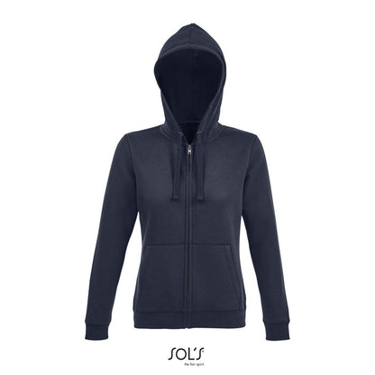 Sudadera con capucha y cremallera para mujer fabricada en FLEECE 280g de bajo encogimiento. Composición: 80% algodón ringspun y 20% poliéster, con exterior 100% algodón. Interior perchado, diseño cortado y cosido, bolsillos canguro, cremallera YKK y capucha ajustable. Acabado en puños y bajo de canalé 2x2, media luna y tapacosturas en el cuello. Prenda cómoda y resistente para promociones textiles o vestuario corporativo personalizado. Solo se comercializa con impresión.