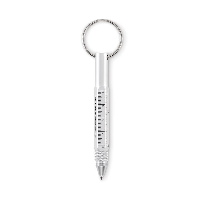 Práctico bolígrafo giratorio fabricado en aluminio reciclado, integrado en un llavero multifunción con regla de 4 cm y 1,5 pulgadas, puntero táctil y destornillador doble con cabezas plana y Phillips. Escribe con tinta negra. Su diseño compacto (11,7 × 1,1 cm) lo convierte en una herramienta ideal para tener siempre a mano. Perfecto para empresas de servicios técnicos, construcción o ferretería. Hazlo único con tu logotipo y ofrécelo como regalo corporativo útil y sostenible.