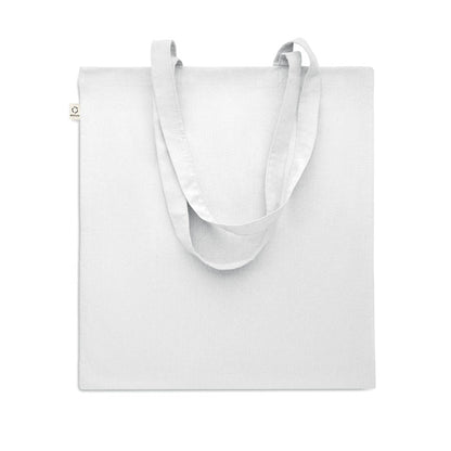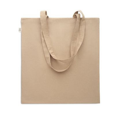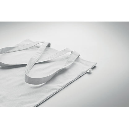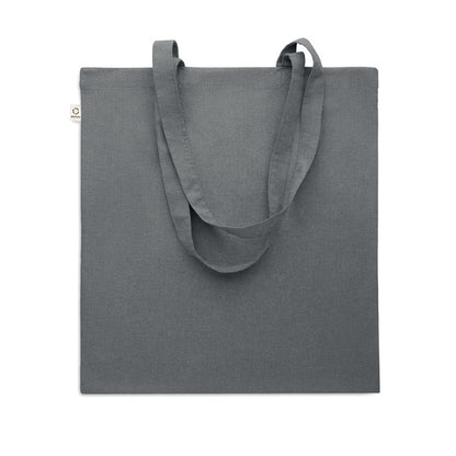 Bolsa ecológica fabricada con 70% algodón reciclado pre-consumo y 30% RPET, con asas largas que facilitan su transporte. Su tejido de 140 g/m² combina resistencia y ligereza, ideal para promociones, eventos y uso diario. Mide 42x38 cm, perfecta para llevar compras o materiales promocionales con un enfoque sostenible. Puede presentar ligero encogimiento tras la impresión. Un artículo que proyecta el compromiso ambiental de tu marca, aportando un regalo funcional y eco-amigable que fortalece la visibilidad corporativa de forma eficaz.