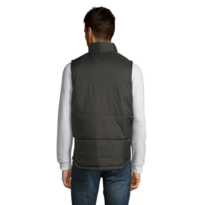 Chaleco acolchado unisex confeccionado en 100 % poliamida, con forro y relleno 100 % poliéster. Diseño ligero y cómodo, con revestimiento de poliamida 210T que mejora la resistencia al viento. Cuenta con cremallera frontal y dos bolsillos laterales también con cremallera para mayor funcionalidad. Una prenda versátil para eventos al aire libre, ferias, equipaciones laborales o como textil promocional en épocas frías. Disponible en varias tallas (ver tabla en documentación del producto). Opción resistente y práctica para acciones de merchandising o regalos corporativos con posibilidad de personalización.