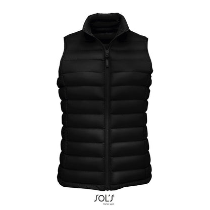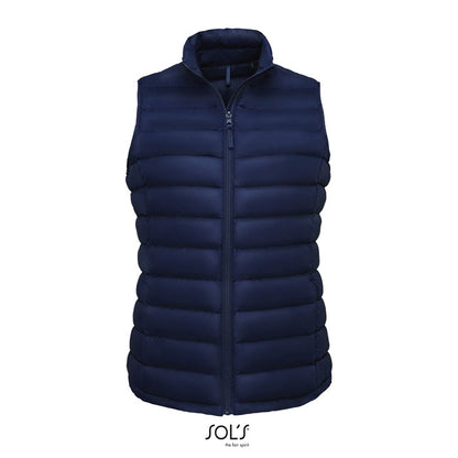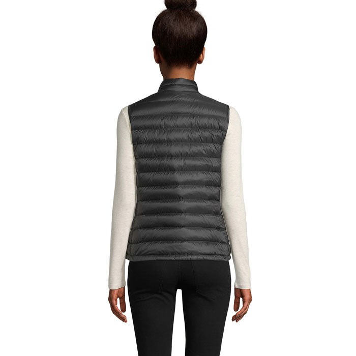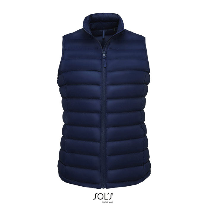 Chaleco acolchado ligero para mujer con corte ceñido y cuello alto. Fabricado en poliamida 380T, con forro 100 % poliamida y relleno sostenible de 60 % Sorona y 40 % poliéster reciclado. Cuenta con dos bolsillos delanteros con cremallera y dos interiores. Se pliega fácilmente en su bolsa con topes, perfecto para merchandising, ferias o eventos al aire libre. Certificación OEKO-TEX®. Solo disponible con impresión, ideal para acciones promocionales con marca. Disponible en varias tallas (ver tabla en documentación del producto).